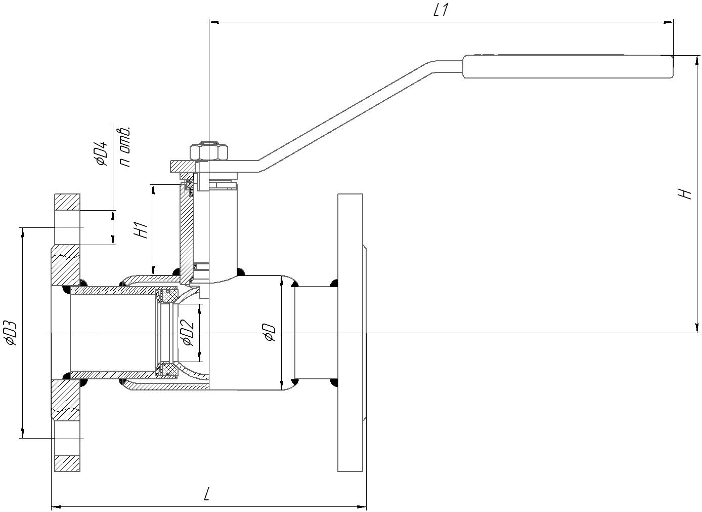 | Артикул | DN | PN | L | L1 | H | H1 | D | D2 | D3 | D4 | n отверстий | Вес, кг | |